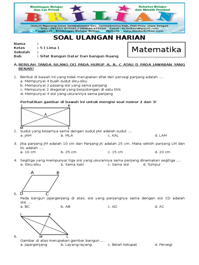 Soal Ulangan Harian Matematika Materi Bangun Ruang Kelas 5 Diary Guru from 1.bp.blogspot.com Perhatikan sifat sifat bangun datar di bawah. Mar 27, 2020 · soal dan pembahasan bangun datar kelas 6 sd. Berdasarkan standar kompetensi terbaru yang mengacu pada kueikulum terbaru. (2) mempunyai 6 titik sudut. (4) sisi tegak berbentuk persegi panjang. (2) mempunyai 6 buah bidang sisi yang tidak sama ukuran. Sebuah prisma segitiga yang volumenya 560 cm dan luas alasnya adalah 40 cm. Memiliki 6 sisi yang berbentuk persegi.