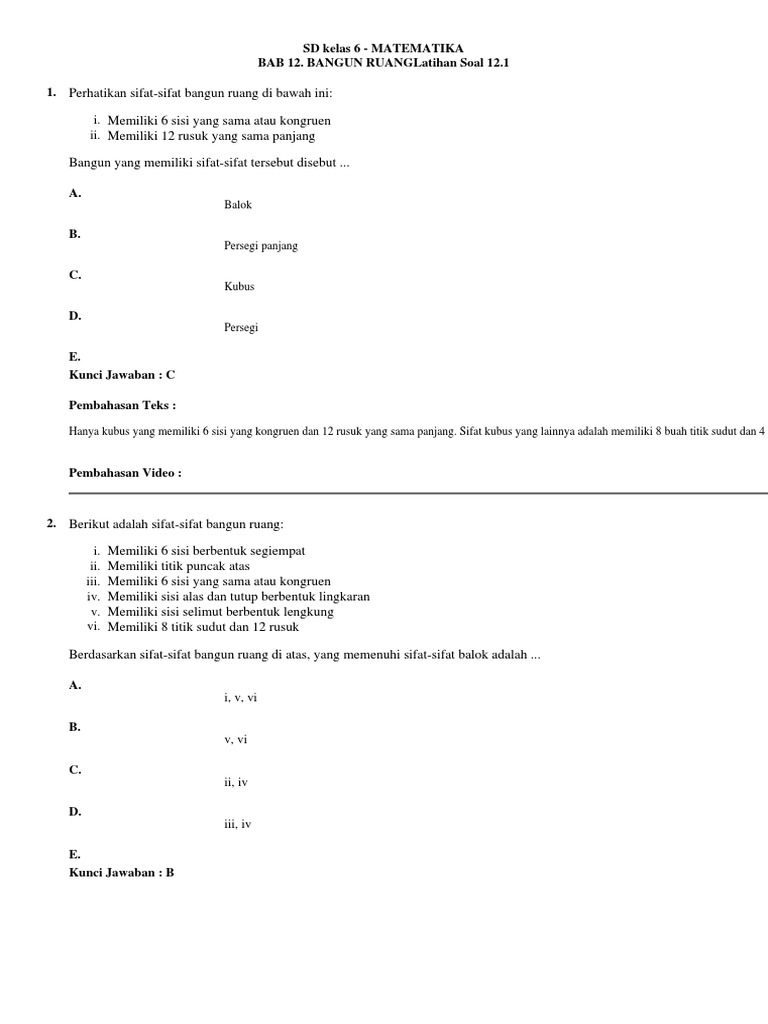 Soal Sifat Bangun Ruang Kelas 6 / Berikut Soal Sifat Bangun Ruang Kelas 6 : Cocok untuk latihan sobat pembelajar bagi yang masih belum paham dengan pokok bahasan ini.. Memiliki 6 sisi yang sama luasnya. (3) mempunyai 12 buah rusuk. Mar 27, 2020 · soal dan pembahasan bangun datar kelas 6 sd. Download soal matematika kelas 1 sd semester 2 bangun datar ada banyak problem yang bisa saja timbul dari masuknya anak anda di jenjang 1 sekolah dasar. Soal dan juga pembahasan jawabannya.